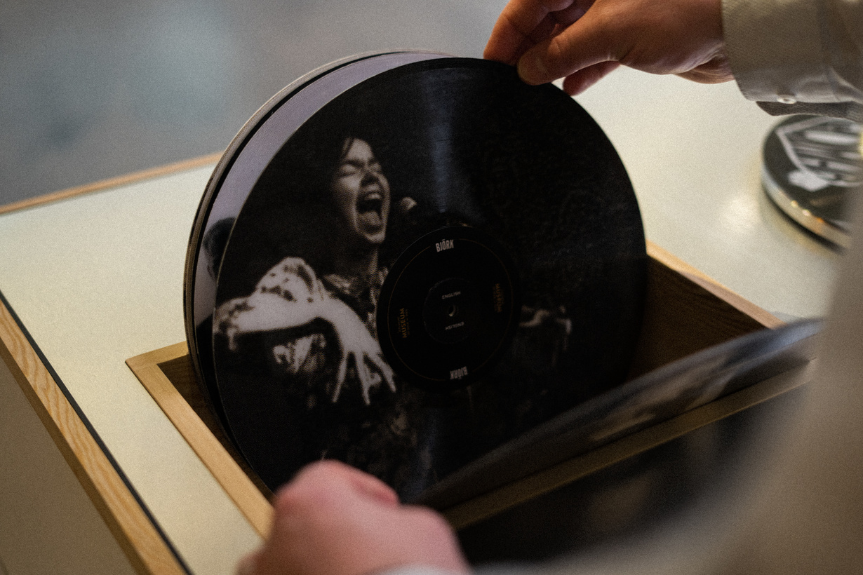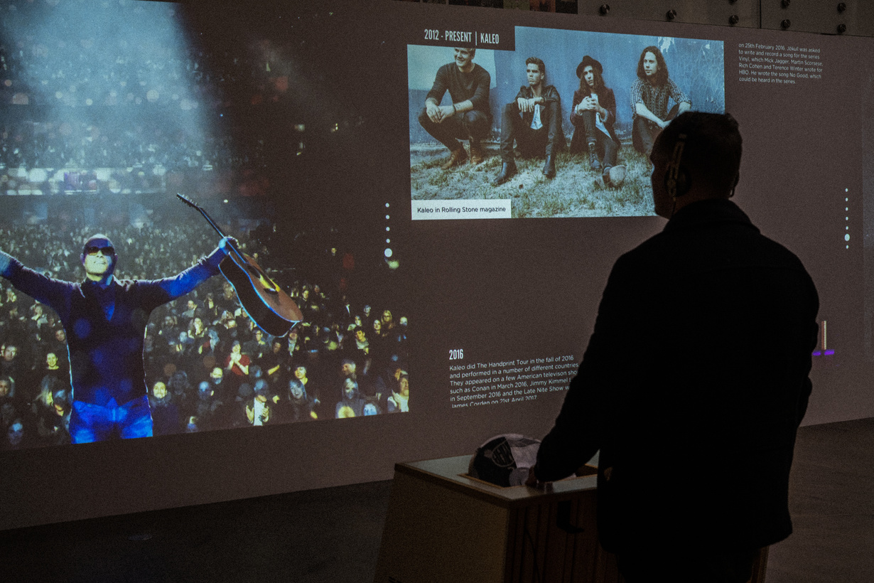 The Record Player allows visitors to develop numerous timelines with information about individual musicians who have made their mark on Iceland's music history. They can dive deep into the history of each artist and/or bands by placing an LP record onto the player. In doing so an audio/visual timeline emerges from the wall with texts, photographs, videos and music-making the installation a multilayered, immersive experience.