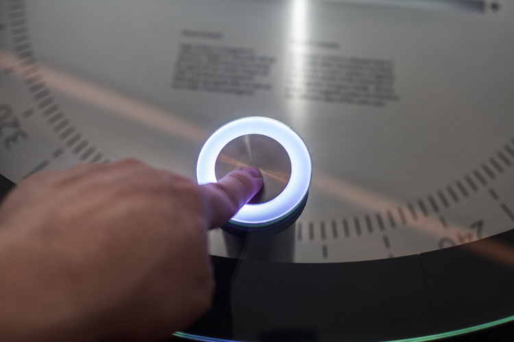 The wind-power station became another playful highlight: visitors compete to capture digital wind projected over an abstract landscape. Rather than handle bulky wind turbine models, they control the action with small triangular buttons. The button, however, casts the shadow of a windmill that spins in proportion to the wind it captures.