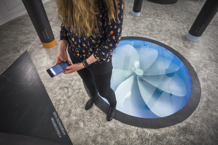 The largest installation is the energy cluster, where visitors open valves to control the flow of geothermal steam and hydropower. The more they open the flow, the faster a massive turbine embedded in the floor spins, filling the space with sound and light.