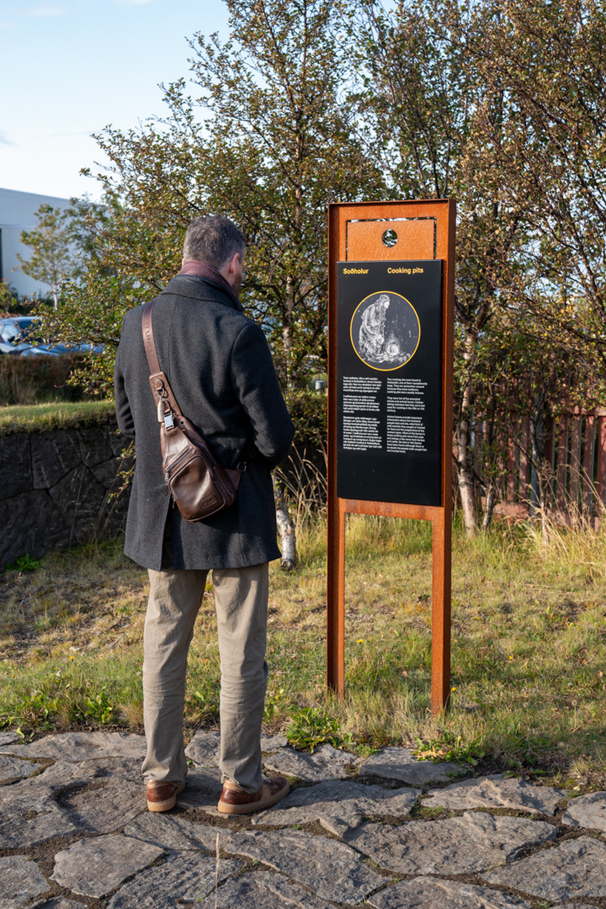 The Hofsstaðir Archaeological Site is one of the very few sites where settlement relics are still visible on the surface. Gagarin installed three VR binoculars in the park to give visitors a sense of lost times, allowing them to peer back into history. There, they discover how the Settlement farm was constructed, what it looked like, and the main activities of the people living there. Concurrently, educational signs have been comprehensively updated, extending the exhibition from the archaeological site to the center of town (Garðatorg 7).