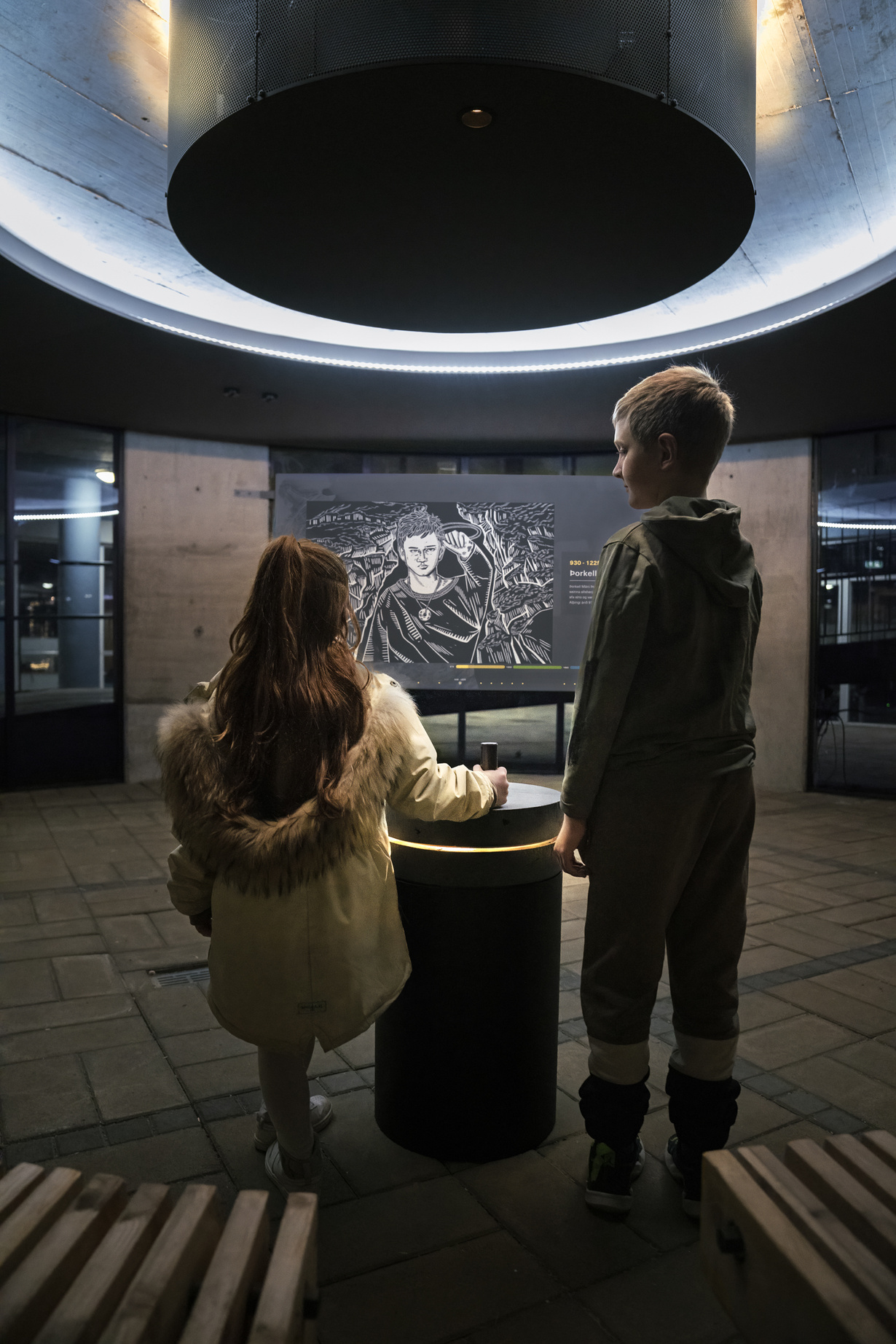 In a circular space at Gardatorg, visitors experience a new exhibit titled "Back to Hofsstaðir," where they can "grind" through the history of Garðabær from its early settlement to the present day. The grinding stone installation is inspired by a grinding stone excavated at the Hofsstaðir settlement farm.
