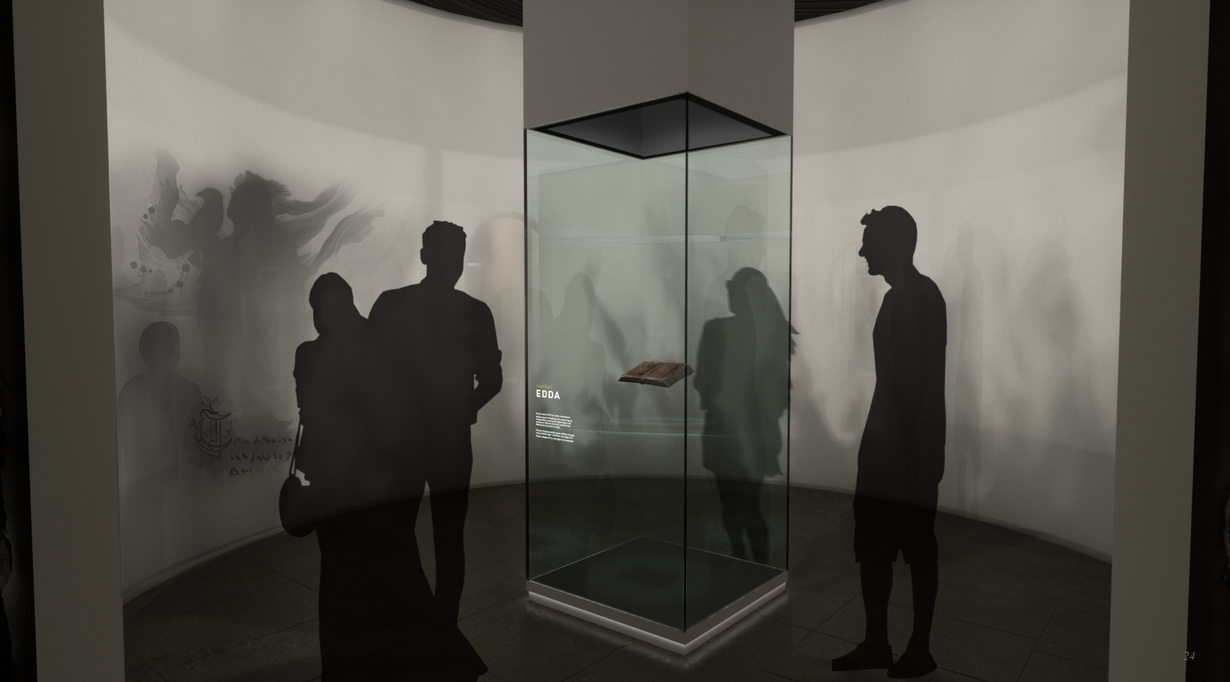 Gagarin was invited to create a concept for the Árnastofnun exhibition, where for the first time, the most precious manuscripts of Iceland, previously only available to scholars, would be made available for the public to see.