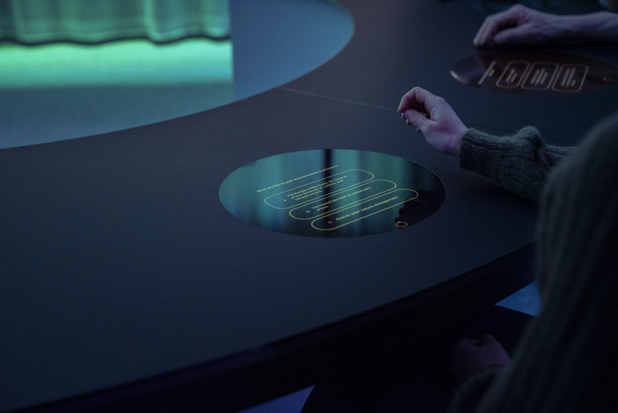 Visitors sit at a circular table where the experience begins with a virtual reality experience. Visitors wear VR goggles (not shown in this image) and are taken on a bird’s eye view journey through the national park in wintertime, encountering its many inhabitants and vast plains.