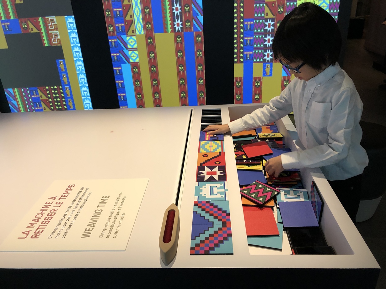 Weaving Time at the end of the exhibition invites visitors to be creative and immerse themselves in a world of patterns. The visitor can weave lines of patterns to the tapestry that wraps around the space.