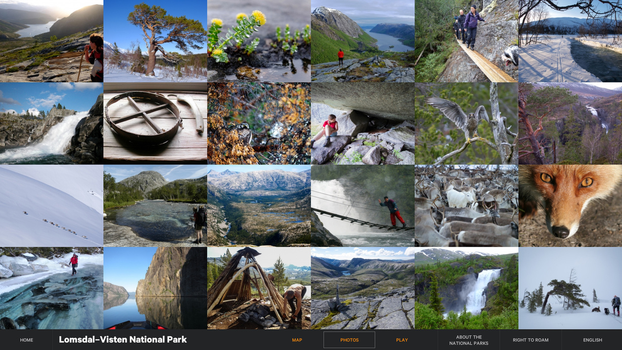 The installation is in three languages, Norwegian, English, and North-Sami. It is displayed on a large touch screen and will be located in the 15 visitor’s centres throughout Norway. The project has been implemented in close collaboration with the client, the Norwegian Environment Agency overseeing the project on behalf of the National Parks of Norway.