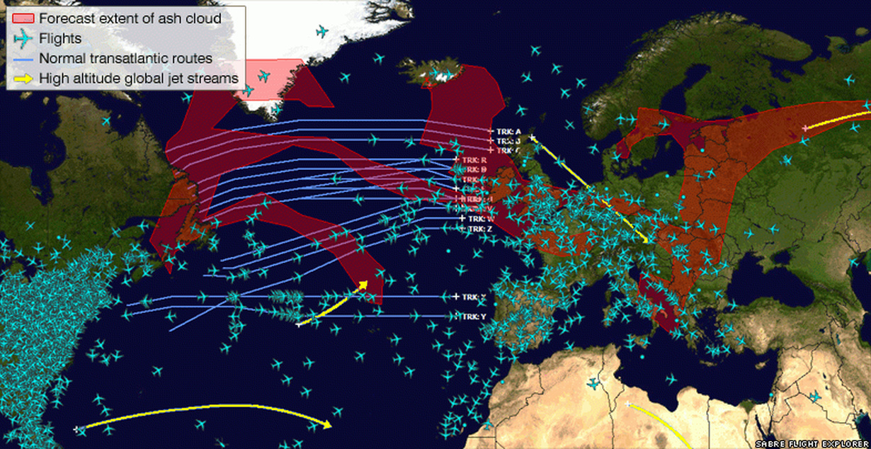 Snapshot of North American and European flights. Photo: www.news.bbc.co.uk/2/hi/8625813.stm