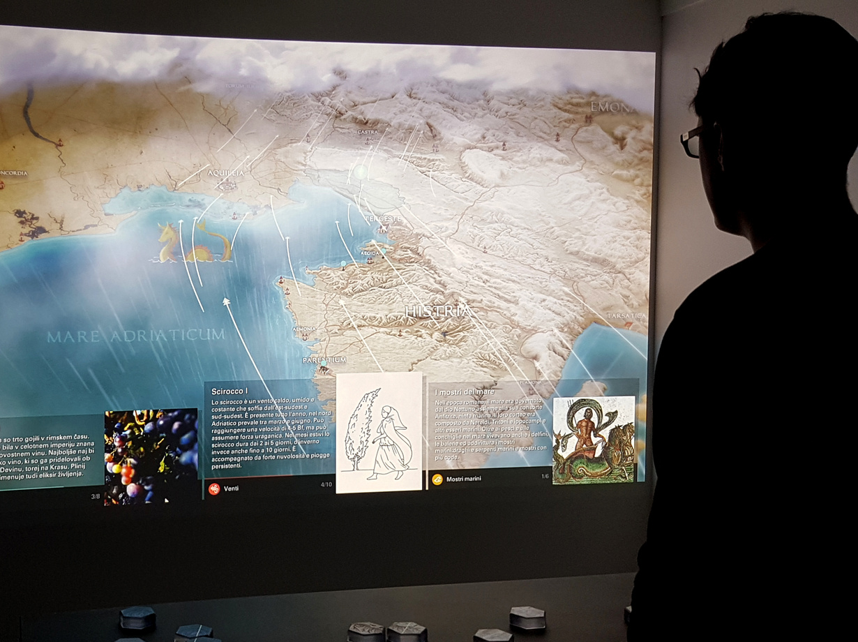 The map installation allows multiple users to simultaneously explore 20 different topics from the archaeological excavation side of the Roman villa, and various interesting topics connected to Roman times such as agriculture, geology, trade, sailing and culture in and around Slovenia.
