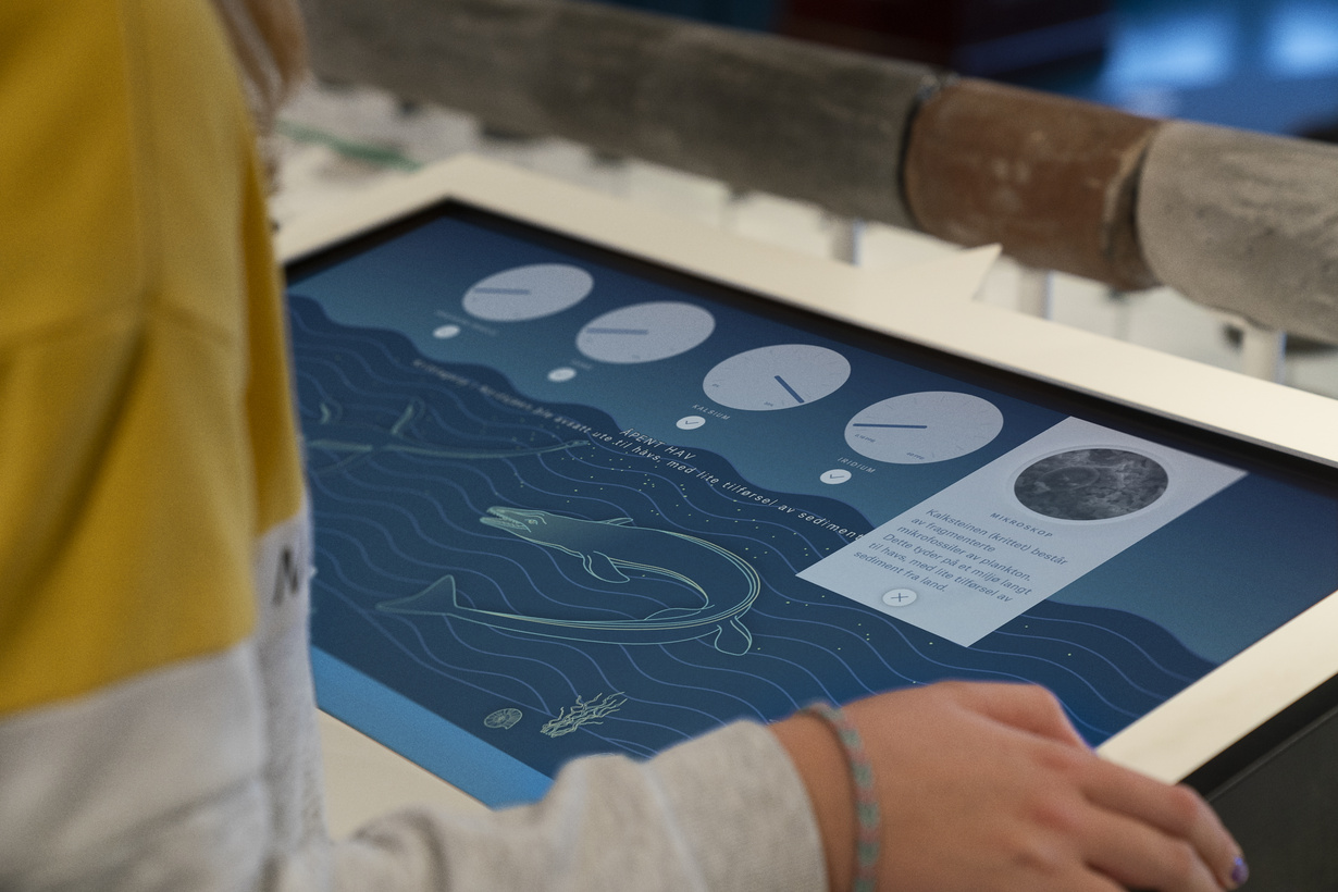 Drill core: Interactive screens slide along a 7,55m long replica of a drill core on either side. The screens scan the drill core and teach the visitor what they are looking at and how we use those values to determine ecosystems of past periods.