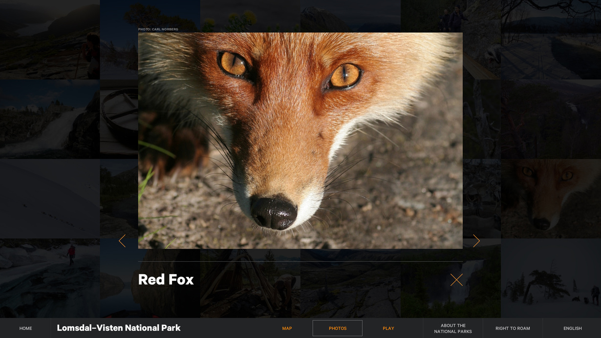 The installation is in three languages, Norwegian, English, and North-Sami. It is displayed on a large touch screen and will be located in the 15 visitor’s centres throughout Norway. The project has been implemented in close collaboration with the client, the Norwegian Environment Agency overseeing the project on behalf of the National Parks of Norway.