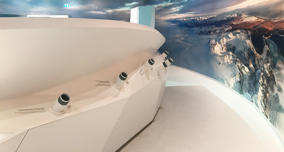 Through monoculars, visitors can zoom into a glacier and study the surreal flora and fauna that can be found there. Every zoom level is accompanied by information and a microscopic view of the different life forms living in and on top of the glacier.