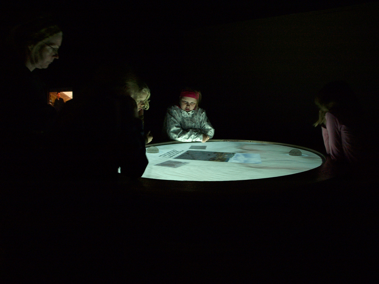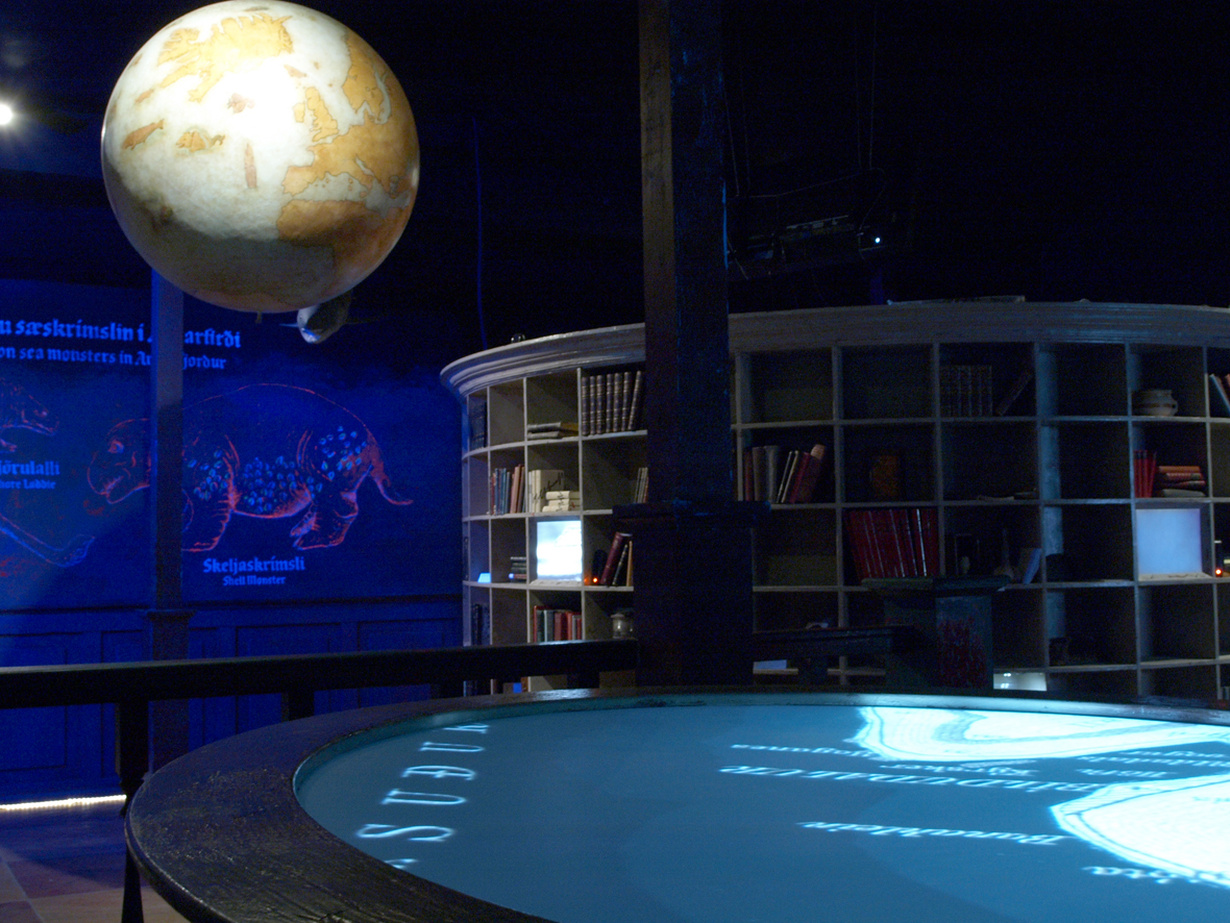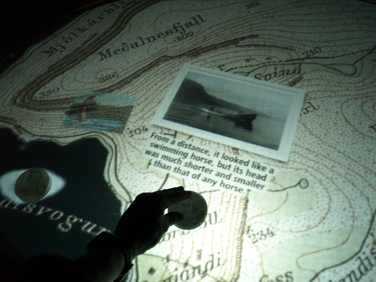 Gagarin designed an interactive table for the Sea Monsters Centre in Bildudalur Iceland. The table shows a map of Arnarfjord wherein visitors can hunt for monsters in the fjord and find tales, stories deriving from the area.The interaction design is aimed at providing an organic interactive experience where everything is intuitive for the visitor. The maneuvering of the map is done by rotating wheels and the monster hunt is done via "shells" moved around on the table which tells the visitor where the monsters are lurking and puts the visitor in charge of the story telling narrative. The table was designed and built by Gagarin from the ground up.