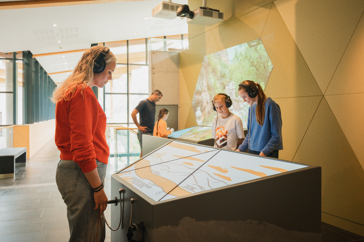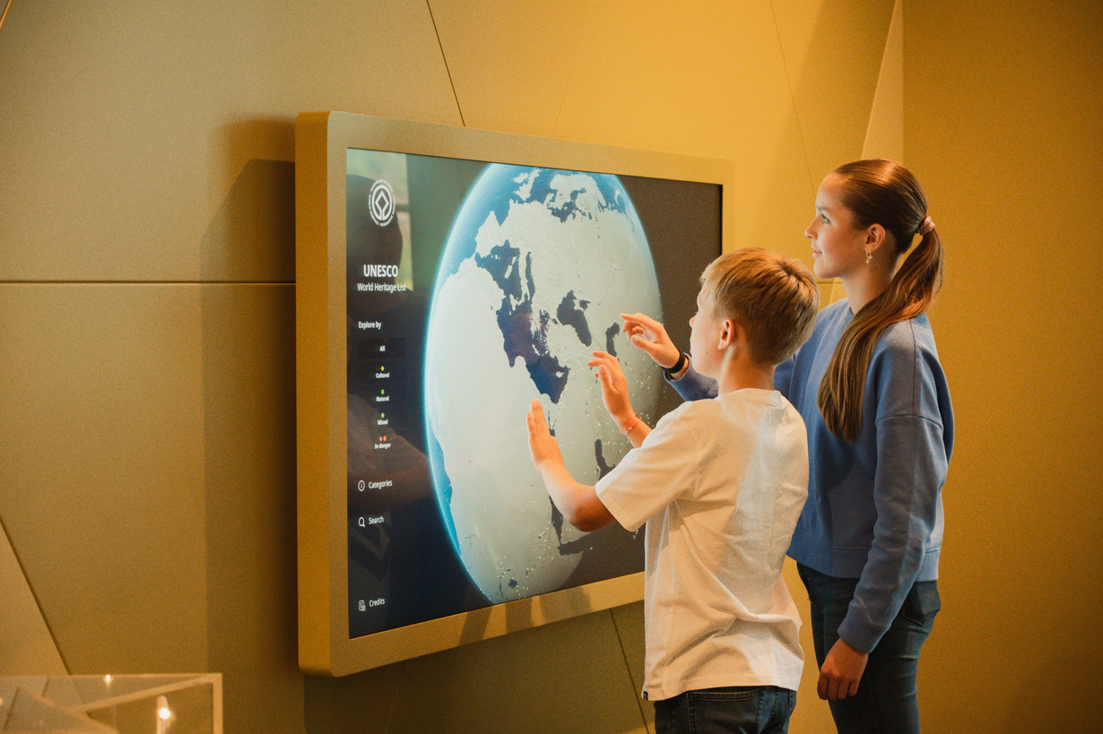 The 'Interactive World Map' is a captivating digital globe displayed on a large, wall-mounted touch screen. Designed to encourage exploration, visitors can discover and learn about World Heritage sites worldwide. By spinning the globe and using intuitive touch gestures to zoom in or out, the interactive experience mimics the behavior of a physical desk globe. Visitors can pick a site and explore information on a specific World Heritage. Visitors can navigate to their own country and even register a site that they believe deserves a spot on the UNESCO World Heritage list, creating an engaging and participatory experience.